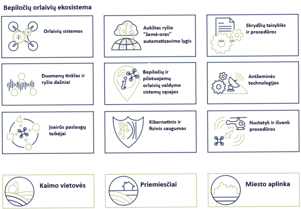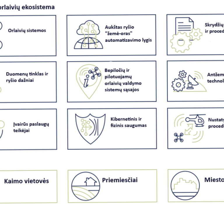 - Dronų skrydžių valdymo sistema, kuri, agreguodama ir sintetindama gaunamus duomenis iš įvairių paslaugų teikėjų, užtikrins saugius skrydžius;